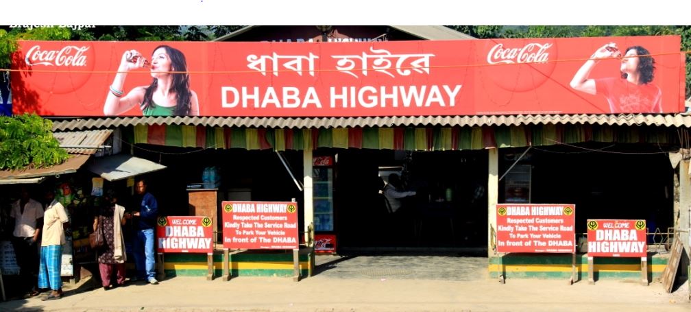 We stopped for tea at Dhabha Highway at Rah. Relatively clean washrooms. (Yesterday at Kareng Dhabha, the washroom was a series of broad leaves hastily thrown together in a reactangular shape with gaping holes all around that tried to enclose 2 bricks on either side of a hole in the floor). The dhabha was a popular stopping point for vehicles on this route until the new highway came in, which now runs about 15-20 feet above the dhabha. The enterprising Punjabi owners have added a staircase for customers to climb up and down while also affixing a couple of notices saying “Dhabha customers, please park cars on the service road and not on the highway”